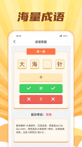 游戏的闯关模式让你在轻松的环境中进行成语挑战。玩家可以选择不同的难度级别,从简单到困难,逐步提升自己的成语水平。每日都有新的题目更新,确保你在每次游玩时都能接触到新的内容,避免了重复性疲劳。