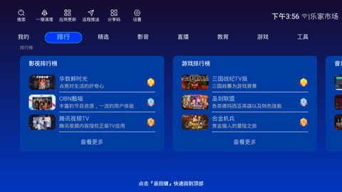 乐家市场是一款针对智能电视和电视盒子设计的应用市场,提供各种影视、游戏、教育等类型的软件和资源,方便用户下载和安装。乐家市场为智能电视和电视盒子用户提供丰富、安全、高品质的应用资源,使用户可以获得更愉快的智能电视体验。