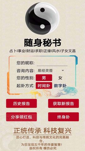 随身秘书APP是一款专注于生活智慧的应用,旨在帮助用户从国学经典中汲取智慧,解决生活中的各种问题。能让你了解自己的职业、爱情、家庭状况,还能帮助你规划未来的方向。通过这个应用,获得全面的生活指导,体验到古老智慧与现代生活的完美结合。无论是遇到生活困惑,还是希望提升自我,随身秘书APP都能为你提供实用的建议和支持。
