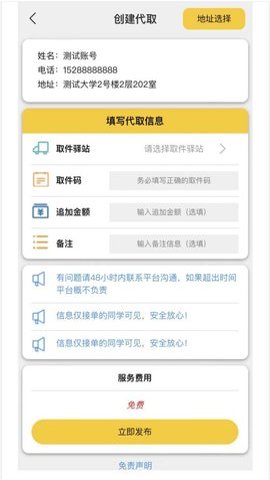 4、发布任务时,输入收货人地址和相关商品信息,确认无误后点击“发布”,任务就会显示在平台上。