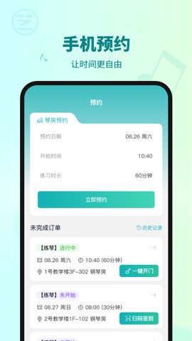 1、手机预约功能让用户随时随地进行课程和练习室的预约,避免了传统预约方式的繁琐,提升了学习效率。