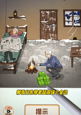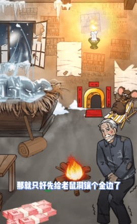 先给老鼠洞镶个金边这款游戏原来的名字叫做文字找茬大师,游戏里一个关卡叫做帮助爷爷过冬,玩家们需要运用有限的资金来帮助关卡中的老人渡过寒冬。这关离谱的地方在于玩家可以把钱花在屋子里的老鼠洞上,为老鼠洞镶金边,宁愿让老鼠过的舒舒服服也不让爷爷过冬,真的是大孝子了属于是。