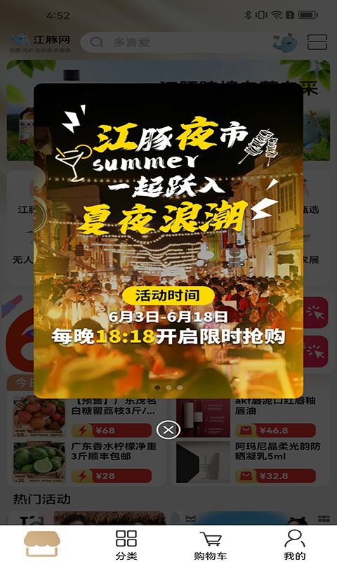 1、首先下载并安装江豚网应用,打开后你会看到一个简洁的首页,展示了热门商品和促销信息。