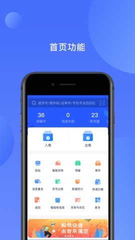 递管家驿站app的功能主要分为入库和出库两大板块,可以十分方便的帮助您记录到站点的货物信息,内置数据统计、智能柜信息、货架号状态等诸多功能,极大的方便了您进行日常工作。