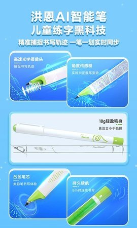 纸屏同步走:软件与硬件结合的产品理念,带来智能科技与汉字书写相融合的新模式。工业级标准打造的洪恩智能写字笔,实现真实铅笔书写体验,前端配备微观摄像头,精准识别笔画先后顺序、起终点位置、写字用时和握笔姿势等内容,并实时同步至App内。