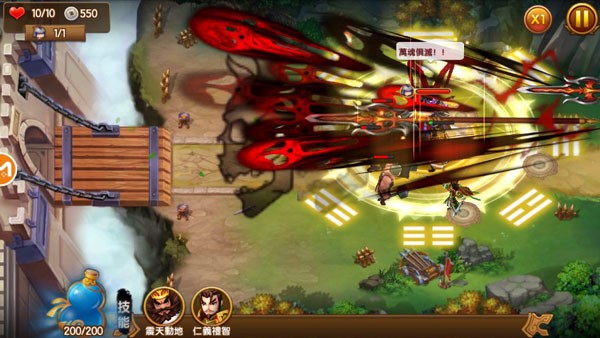 玩法:通过点击旗帜选择上阵武将,拖拽技能图标释放技能以应对敌军的入侵。点击武将可进行升级或者销毁,主要任务是防御敌军的连续入侵。