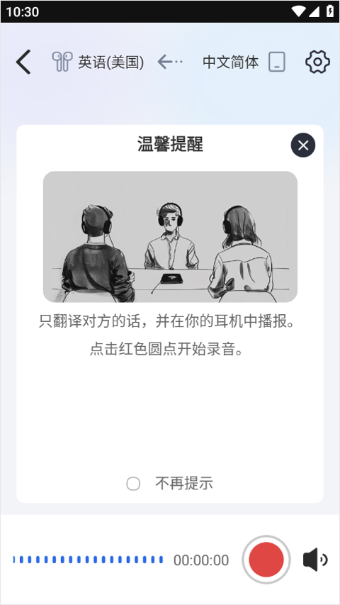 3、想试试同声传译?回到主界面,选择对话模式。这里有个小技巧:如果是两人对话,记得开启双耳模式,这样你们就能各戴一只耳机,像平常聊天一样自然交流了。