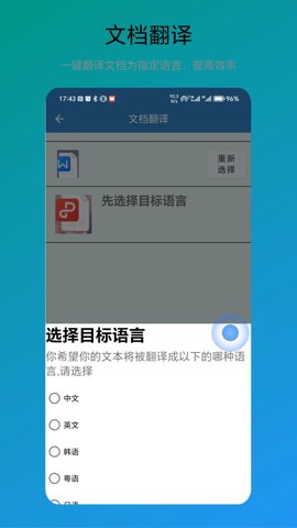 1、支持文件翻译功能,直接上传文档,软件会自动识别并翻译,节省大量时间。