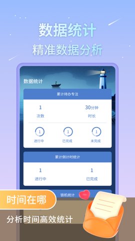 3、统计分析功能,记录用户的专注时长和完成的任务,帮助用户了解自己的工作效率。