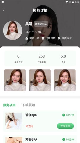 2、按摩师详细资料展示,包括个人简介、专业技能、用户评价等,帮助用户选择合适的服务者。