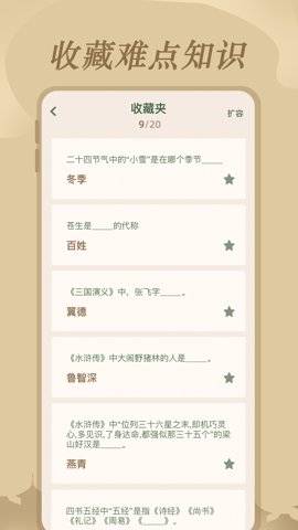 1、收藏本功能,让用户能够将难度较大的常识进行收藏,便于随时回顾和练习。