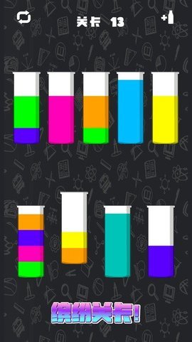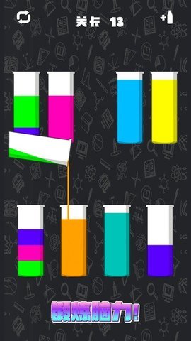 这款游戏的每个关卡都充满了挑战性,玩家需要运用自己的逻辑思维来解决难题。游戏中提供了多种提示,帮助玩家在遇到困难时找到解决方案。通过倾倒试管的方式,玩家不仅要考虑每一步的操作,还要注意液体的颜色搭配,确保相同颜色的液体能够成功倒入同一个试管。