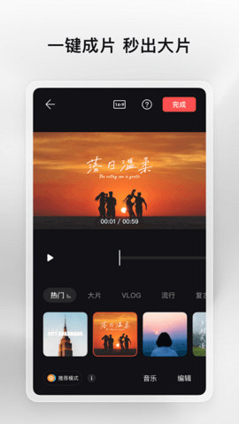 3、点击一键成片按钮,软件会开始智能分析你的素材内容,并自动完成剪辑、添加背景音乐和转场效果。