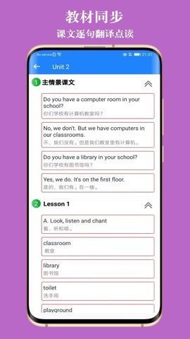 2、支持课文翻译功能,随时查看课文翻译,增强对英语句子的理解能力。