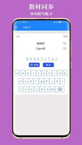 2、提供单元词汇的跟读练习,帮助用户通过反复练习提升口语表达能力,增强英语口语水平。