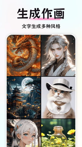 丰富的艺术风格:提供多种艺术风格,让梵高画二次元美少女、蒙娜丽莎化身古风美女风格、有让宫崎骏用工笔画还原哈尔的移动城堡等等。每种画风都具有独特的特征和氛围,让用户精准定位到自己想要的绘画风格。无需绘画技巧,简单描述想法,即可看到专属于用户的作品。