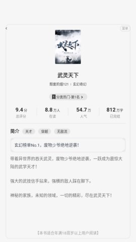 2、在首页选择感兴趣的小说,点击进入书籍详情页,了解书籍的简介和评价。