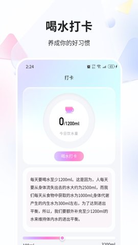在软件主界面找到“喝水打卡”选项,按照提示设置提醒时间,您就可以轻松养成喝水的好习惯。