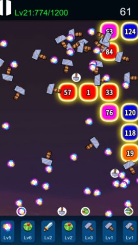 2、击碎砖块不仅能获得经验值,还能掉落各种武器和道具,帮助玩家提升角色的生存能力和战斗力。