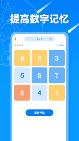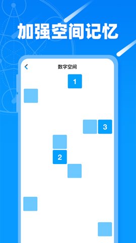 1、数字空间训练,通过对数字的空间记忆进行练习,提升用户的数字记忆能力和空间想象力。