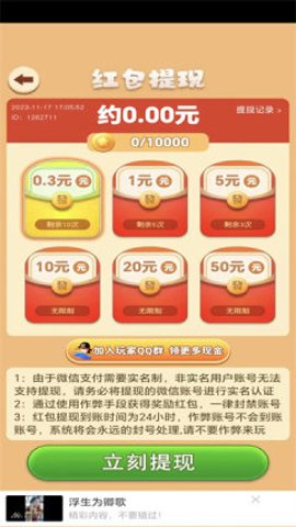 当玩家答对的问题数量达到一定程度后,就可以进行提现,将游戏获得的红包转化为实际的收益。提现的过程简单明了,玩家只需按照提示操作即可。设计让玩家在享受游戏的同时,还能获得实实在在的回报,增强了游戏的吸引力。