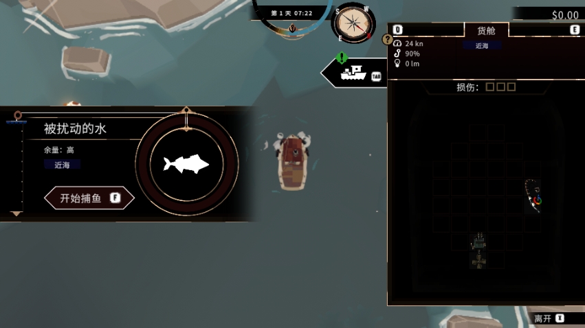 货舱管理:合理摆放鱼获(类似俄罗斯方块),升级船体可增加存储空间。