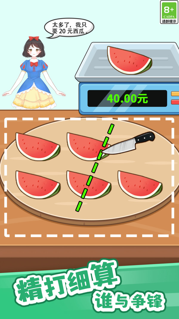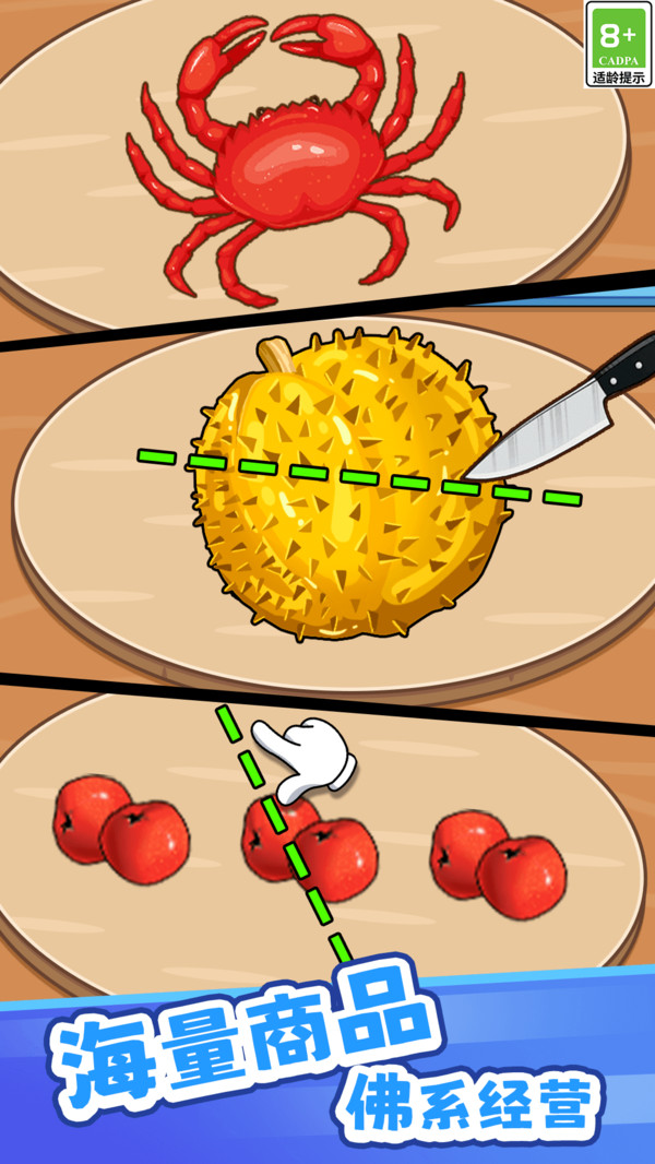 快来切一刀是一款以切割食物为主题的休闲模拟经营游戏,玩家将化身为一名专业的切割高手,迎接前来购买的顾客。游戏的主要目标是通过精准的切割技巧,将各种新鲜的食材如水果、蔬菜、肉类等,完美地切割成顾客所需的形状和大小。随着游戏的进行,玩家将不断提升自己的切割技能,解锁更多的食材和切割工具,体验到经营小店的乐趣。每一次成功的切割都能带来顾客的满意和更高的评分,进而帮助玩家不断壮大自己的店铺。