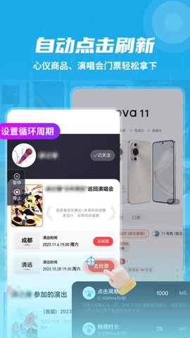 自动连点抢票触控神器是一款专为用户设计的高效工具,旨在帮助大家轻松应对抢票和抢购的挑战。它的出现打破了传统抢票的局限,通过智能化的点击操作,在设定的时间内自动进行抢票,大幅提升了成功率。无论是火车票、演唱会门票,还是限时商品的抢购,这款应用都能轻松应对,帮助你节省时间和精力,真正实现了“解放双手”的目标。