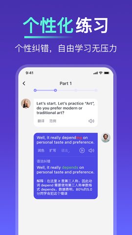 1、支持一对一的口语练习,根据自己的学习进度和需求进行个性化的练习。