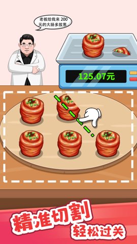 切割绳子的玩法非常简单,玩家只需通过手指滑动来控制刀具,对准食材进行切割。每次切割后,系统会自动称重,玩家需要确保切割后的重量符合顾客的要求。随着游戏的进行,玩家会遇到越来越复杂的切割任务,需要在规定时间内完成,增加了游戏的紧迫感。