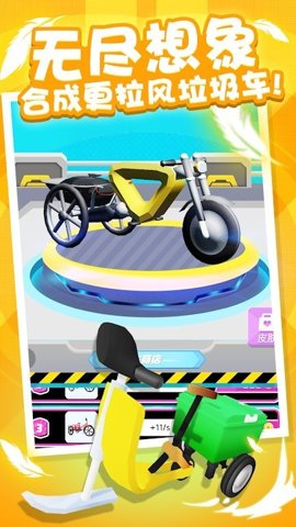 1、垃圾扰乱采用了合成玩法,玩家可以从小车逐渐合成升级为超炫酷的电动三轮车。
