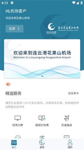 1、打开连云港机场应用,进入主界面,您将看到航班查询和服务预约的选项。