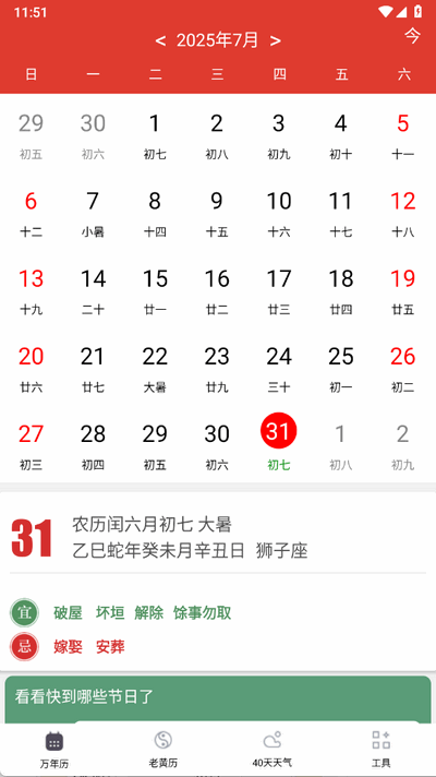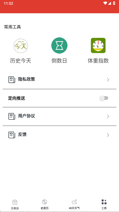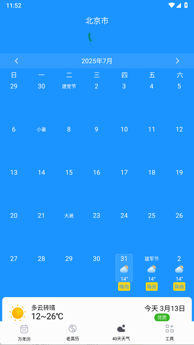 2、提供多种实用工具,用户不仅可以查看日历,还能获取实时天气和生活指数等信息,帮助更好地规划日常活动。