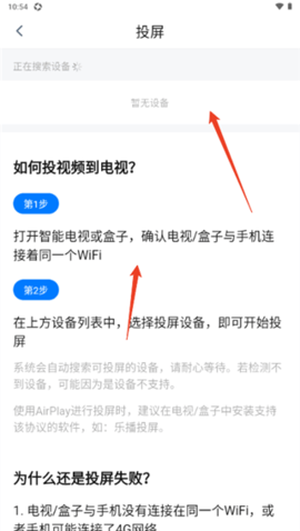 APP会自动搜索可投屏设备(如智能电视、盒子或投影仪),选择对应的设备名称即可完成连接。