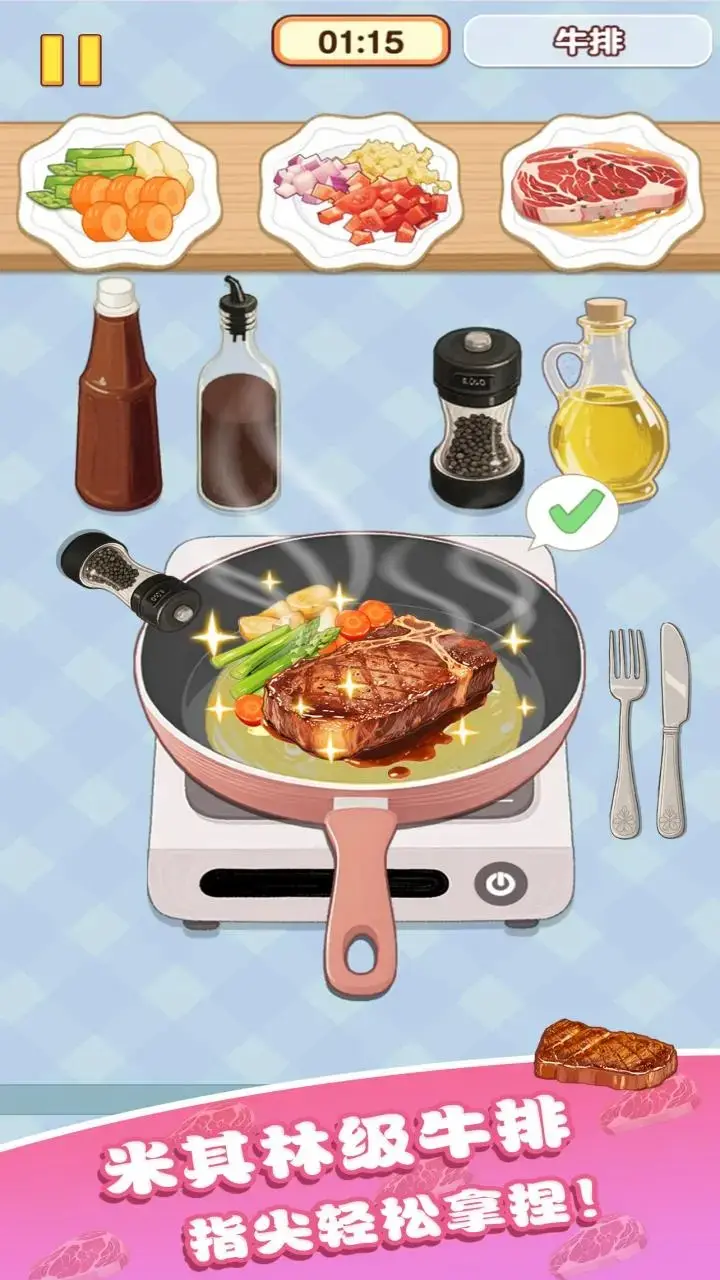 4、游戏的操作界面简洁明了,直观的指引帮助新手迅速掌握烹饪技巧,提升整体游戏体验,降低上手难度。