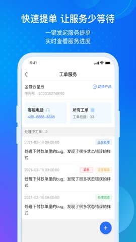 1、金蝶云App通过在线客服和服务提单,为用户提供了快速获取服务帮助的便捷服务。