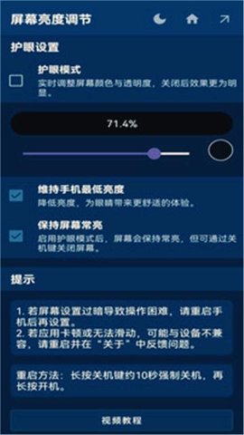 在现代生活中,手机已经成为我们日常生活中不可或缺的工具。然而,长时间盯着屏幕不仅会导致眼睛疲劳,还可能影响视力健康。为了解决这一问题,屏幕调光器app应运而生。这款应用专为用户提供精准的屏幕亮度调节功能,结合多种护眼模式,帮助你在不同环境下轻松选择最适合的亮度设置,减轻眼部疲劳,提升使用体验。