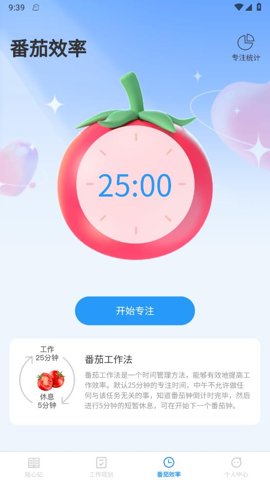 2、提供番茄钟功能,设定专注时间,帮助提高工作效率,减少拖延。