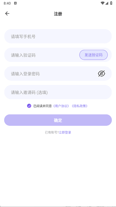 2、在启动界面,用户需同意用户协议,点击立即注册按钮。