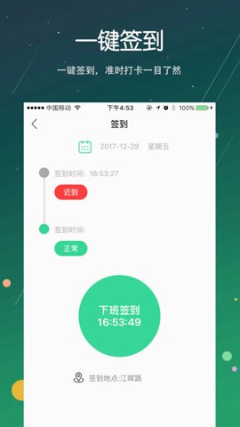 2、在线打卡签到功能,用户只需点击一下即可快速记录上下班时间,方便管理日常工作。