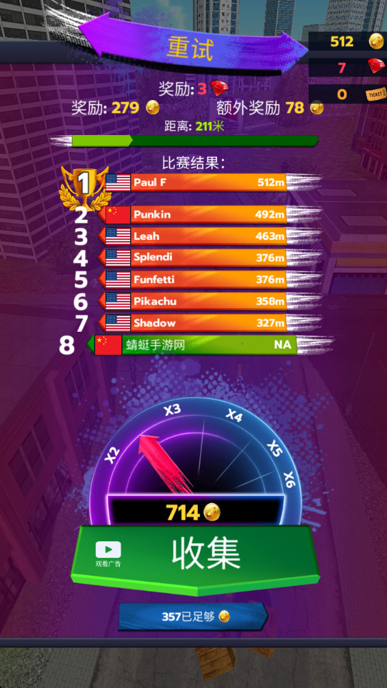 4、金币奖励机制鼓励玩家不断挑战自我,通过比赛获取资源进行角色与滑板的升级。