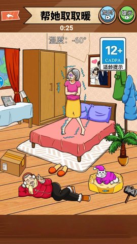 帮助老奶奶是一款非常有趣的休闲益智类游戏,玩家需要帮助一位可爱的老奶奶解决她感到冷的。老奶奶太冷了,玩家需要动动脑筋,利用一切可以保暖的方法,让她感到温暖舒适。