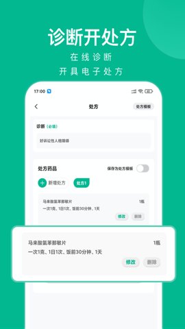3、该应用还提供了“诊断开处方”的功能,医生可以在线进行诊断,并快速开具电子处方。
