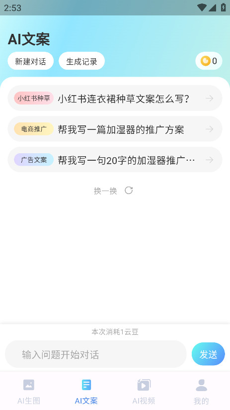 3、如果你想写文案,进入文案创作部分,输入主题关键词,软件会自动生成相关的文字内容,供你参考。