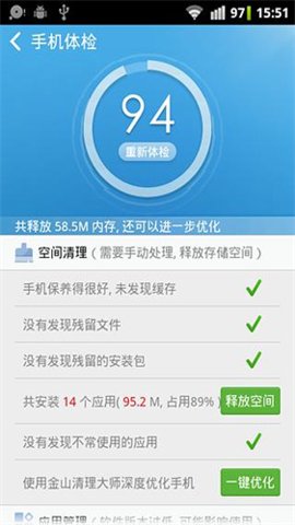 3、通过金山手机助手,一键清理这些无用的文件和应用,从而释放存储空间并提升手机的性能。