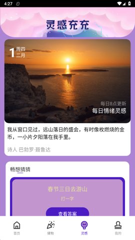 畅想充充是一款独特的手机助手应用,旨在帮助用户记录生活中的点滴灵感和创意,同时提供丰富的猜谜语内容,让娱乐与思考相结合。无论你是想要捕捉灵感,还是想在闲暇时光中进行脑力挑战,畅想充充都能为你提供一个理想的平台。丰富的图片内容不仅能激发你的想象力,还能让你在欣赏的过程中找到更多的创作灵感。快来体验这款充满创意的应用吧!