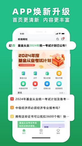 2、优培网校作为一款专注于金融教育的应用,通过提供专业的学习资源和互动平台,帮助金融从业者或学习者提升自己的金融知识和技能。