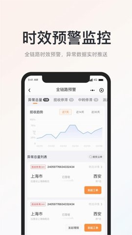 3、时效预警监控,提供全链路的时效监控功能,异常数据实时推送,帮助商家及时处理潜在问题。