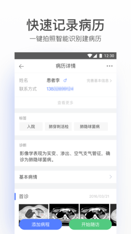 病历夹经典版是杏树林信息技术(北京)有限公司推出的一款专为中国医生打造的应用软件,帮助医生摆脱繁琐的病历管理和低效的医患沟通。无论身在何处,用户都可以通过这款应用实现从病历到病人的全程智能管理。得益于中国第一医学内容语音识别引擎,病历夹经典版能够准确识别超过50万个医学专业术语,用户可通过拍照整理病历,实现100%无差错的图片识别。该应用与微信无缝对接,用户可以便捷地随访病人,而无需暴露个人联系方式,实现智能化管理病人关系。