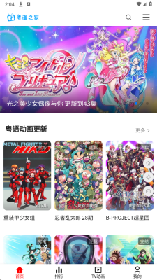 2、启动后进入主界面,浏览滚动横幅或推荐栏目中的热门及最新更新的粤语动漫作品。